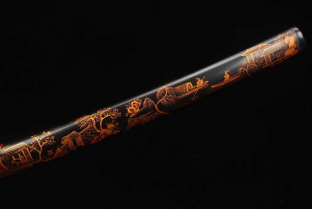 The katana's handle is wrapped in genuine ray skin, tightly covered in Japanese silk, offering a grip that evokes the grace of cherry blossom. Genuine silver and gold finishes add a touch of splendor to this martial instrument. The saya of the Mura no Hogo Katana is a work of art in its own right, adorned with Japanese paintings that tell the story of the village. This object transcends the simple katana to become a guardian of tradition and heritage.
