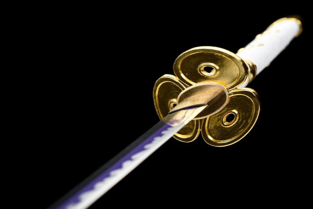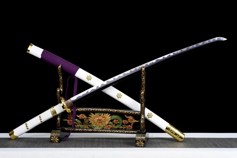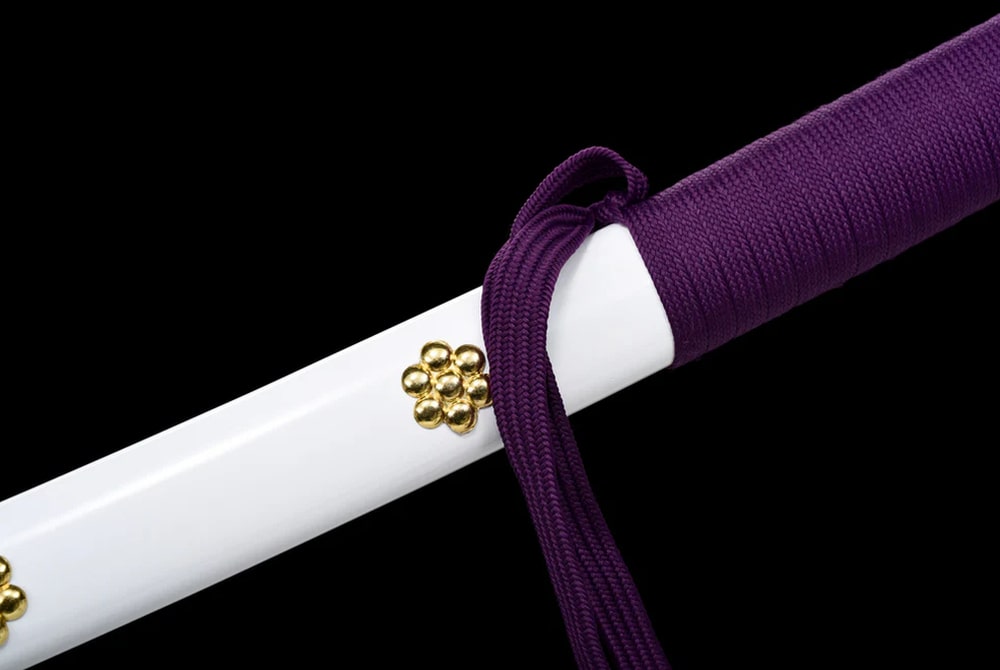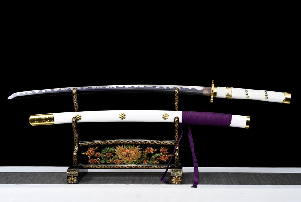 Immerse yourself in the epic world of One Piece with this exceptional katana inspired by the iconic character Oden Kozuki. A purple blade, traditionally hand-forged and clay-tempered, equips this katana that would make even the greatest manga heroes envious. Its white scabbard is made from leather with a wooden core, while the delicate tsuba is crafted from a copper alloy. The creation of this katana follows the ancestral rules of traditional sword-making.