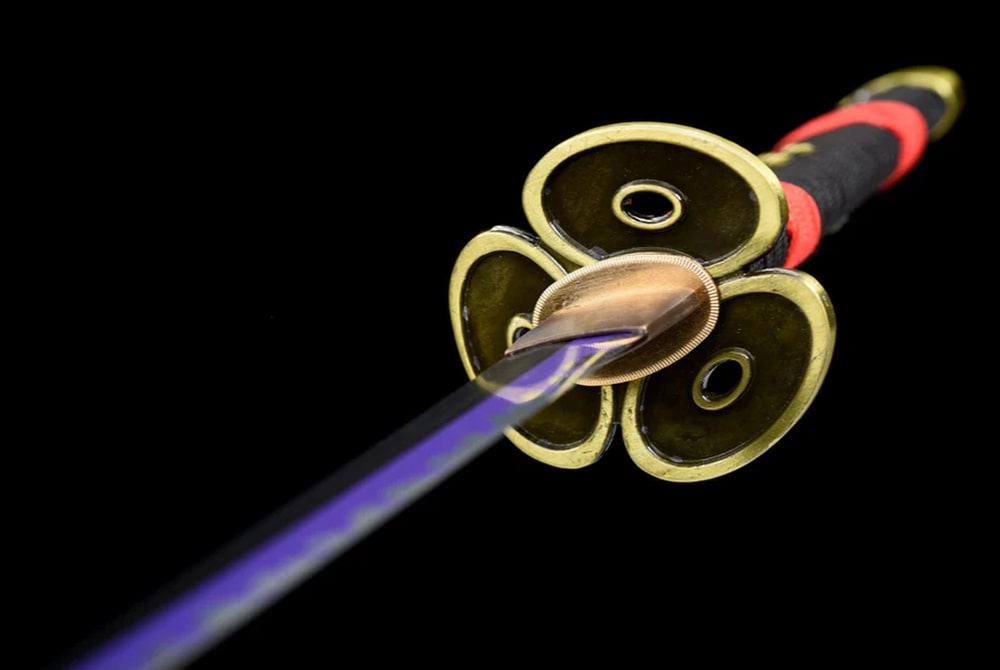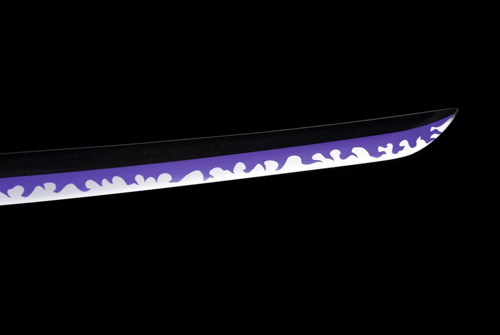 Discover the legendary power of the Enma Katana in its black version, directly inspired by the epic world of the One Piece manga. Hand-forged by expert Japanese artisans, this katana embodies masterful craftsmanship and the heritage of the iconic swords from Zoro’s universe. The scabbard of this Japanese sword is made from leather with a wooden core, while the handle is crafted from solid wood. Its purple blade with wave motifs contains a high proportion of carbon.
