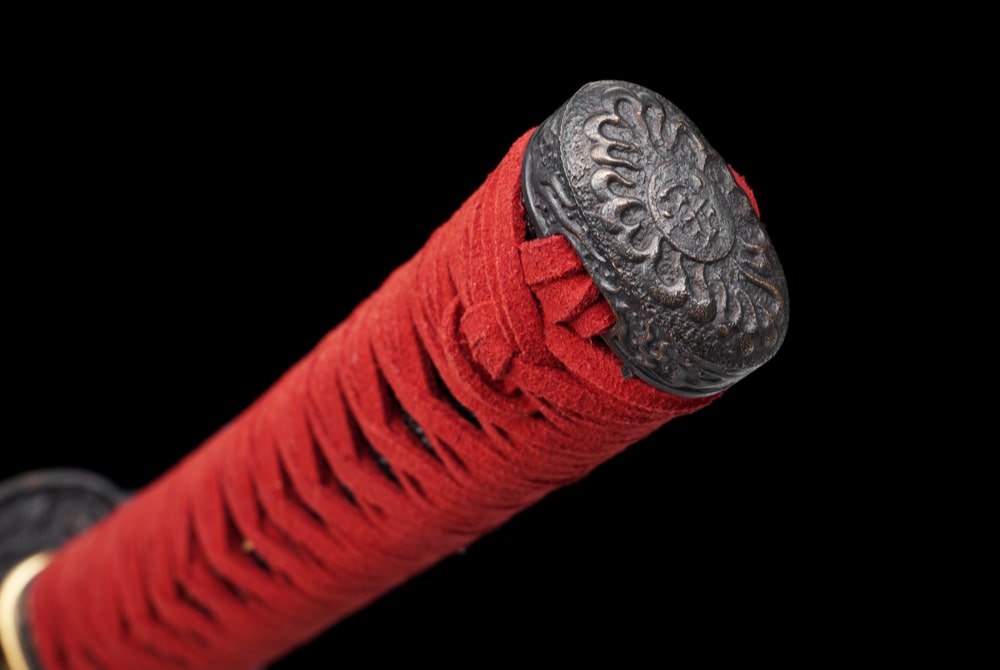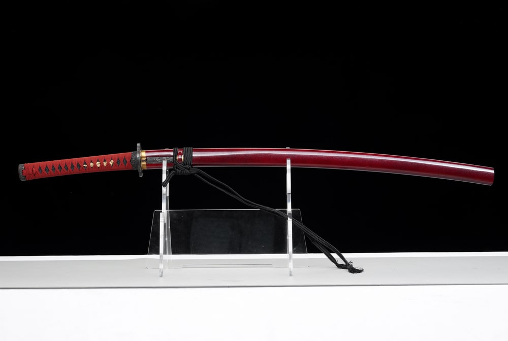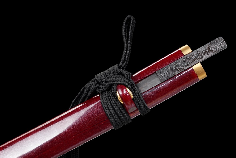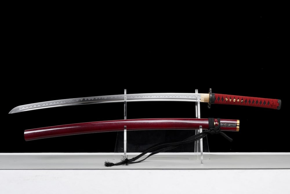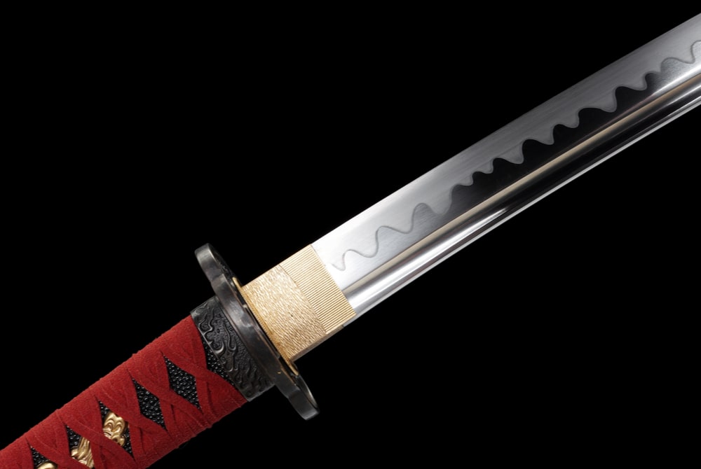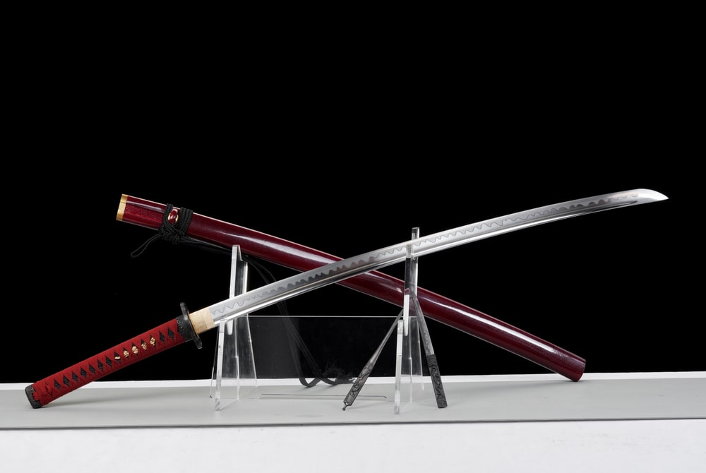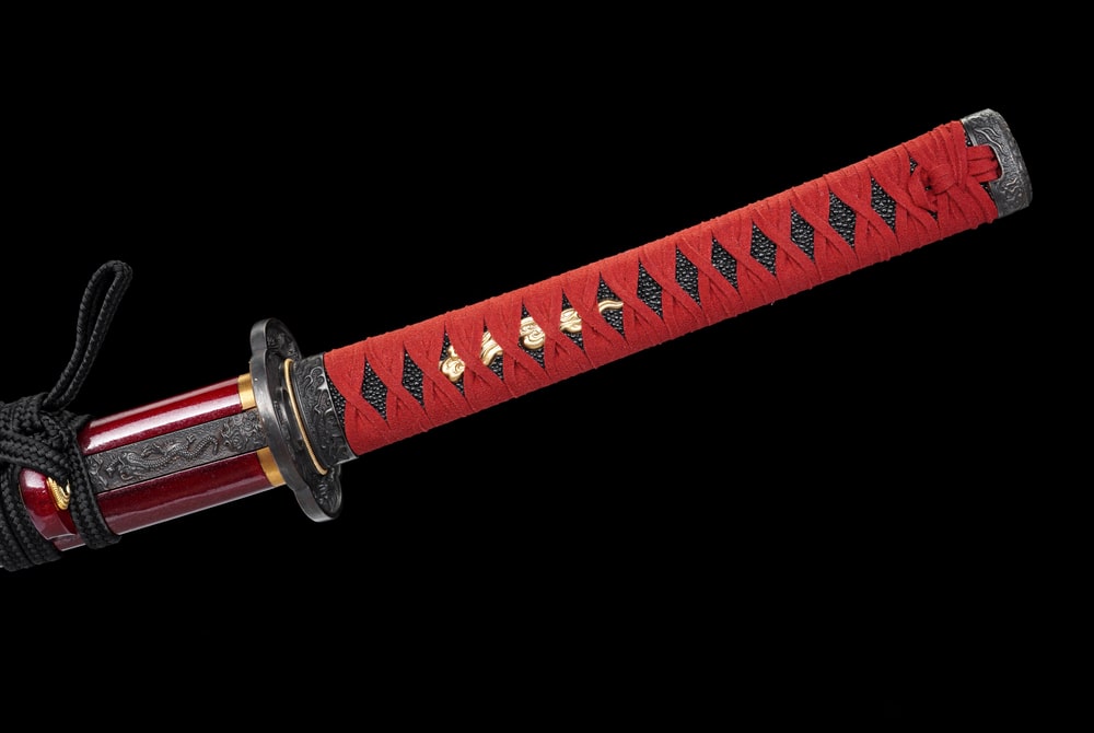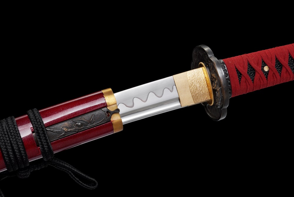 This katana embodies the passion and contained power of Japanese master swordsmiths. Its manganese steel blade is adorned with a subtle hamon, the signature of a heat treatment carried out with great mastery. Yet it is the red lacquered scabbard that truly draws attention: it features two side slots designed to hold kozuka, small traditional utility blades fitted into the saya.