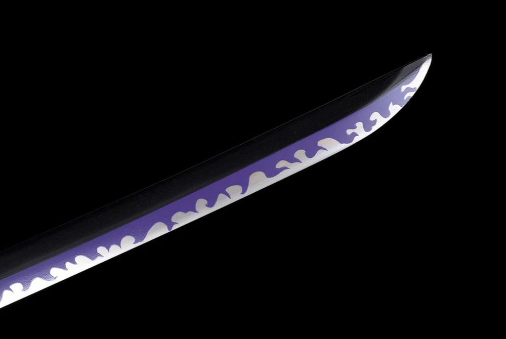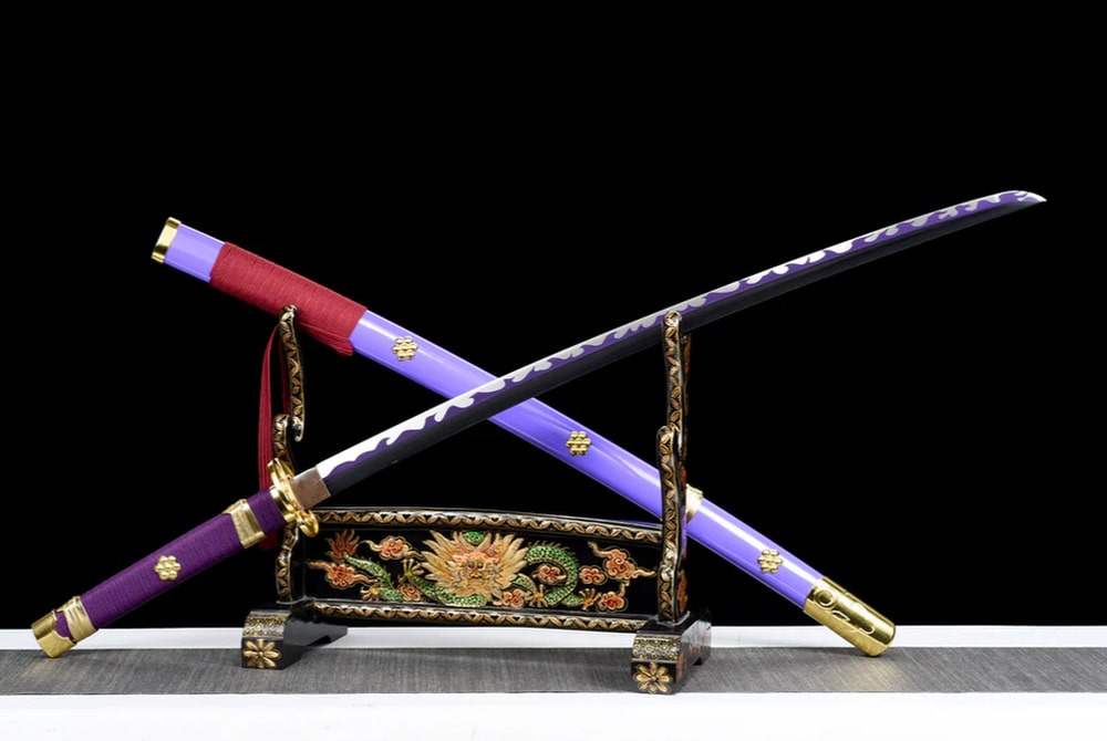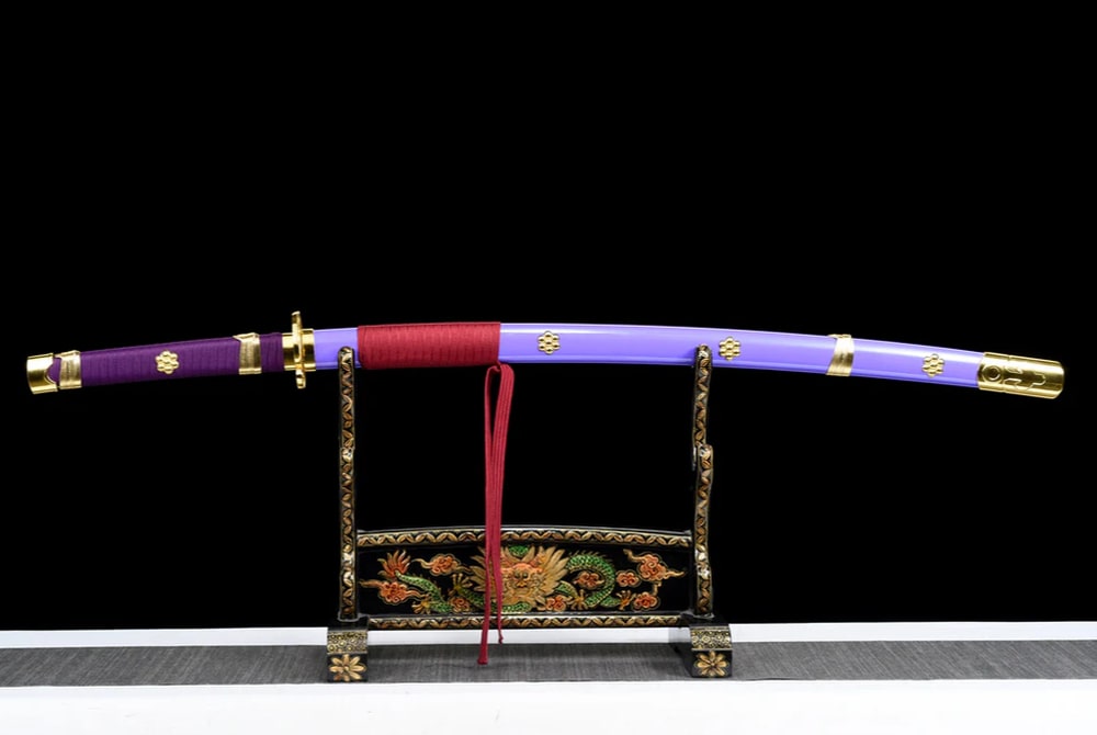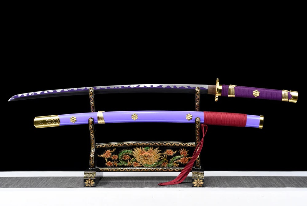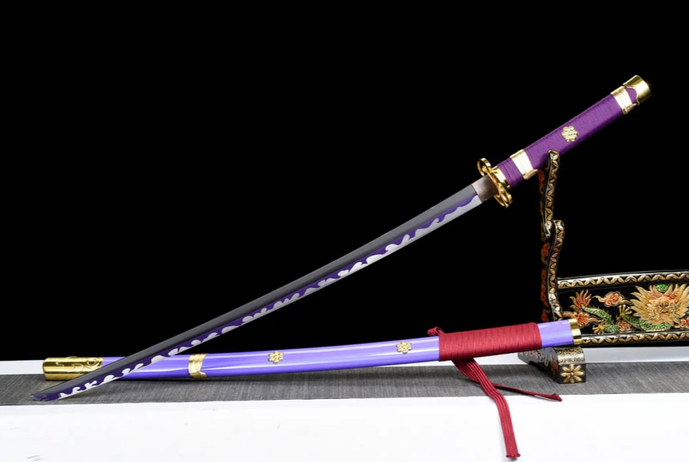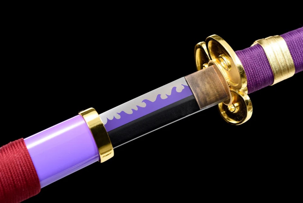 Discover the authentic Enma Katana, a hand-forged masterpiece inspired by the epic world of One Piece and wielded by the legendary Roronoa Zoro. Its purple leather-and-wood scabbard is a true delight to the eyes, while the red sageo cord offers a beautiful visual contrast. The blade is made from high carbon steel, giving it outstanding strength and durability. It is decorated with delicate wave motifs that irresistibly evoke the maritime universe — enough to make you dream of roaming the oceans and claiming the title of Pirate King! Purple is also the colour of nobility and royalty, both spiritually and historically. In ancient Japan, only the most accomplished Buddhist monks were permitted to wear this colour.