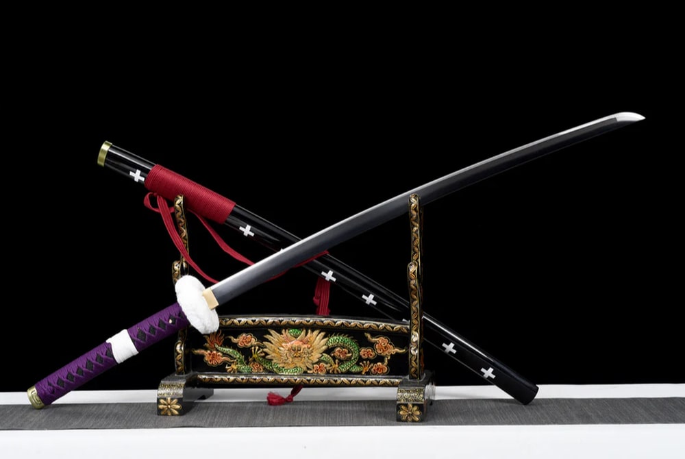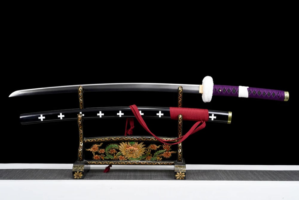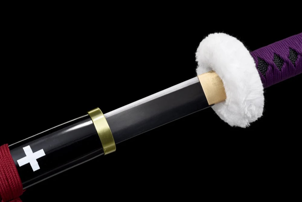 Discover the authentic Trafalgar Law Katana, a faithful replica of the legendary sword from One Piece. The scabbard of this katana is made from solid wood with a black lacquer finish and is decorated along its entire length with white crosses. The handle is also crafted from solid wood, with a purple cord wrapping, while the scabbard cord is red. A hand-forged black blade made from high carbon steel completes this heroic Japanese sword.