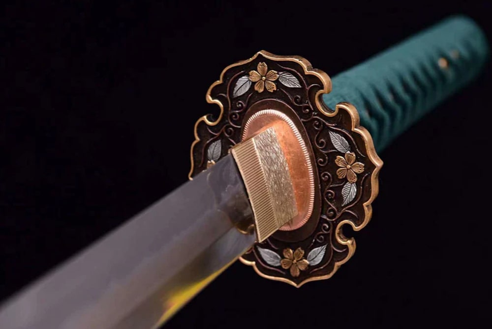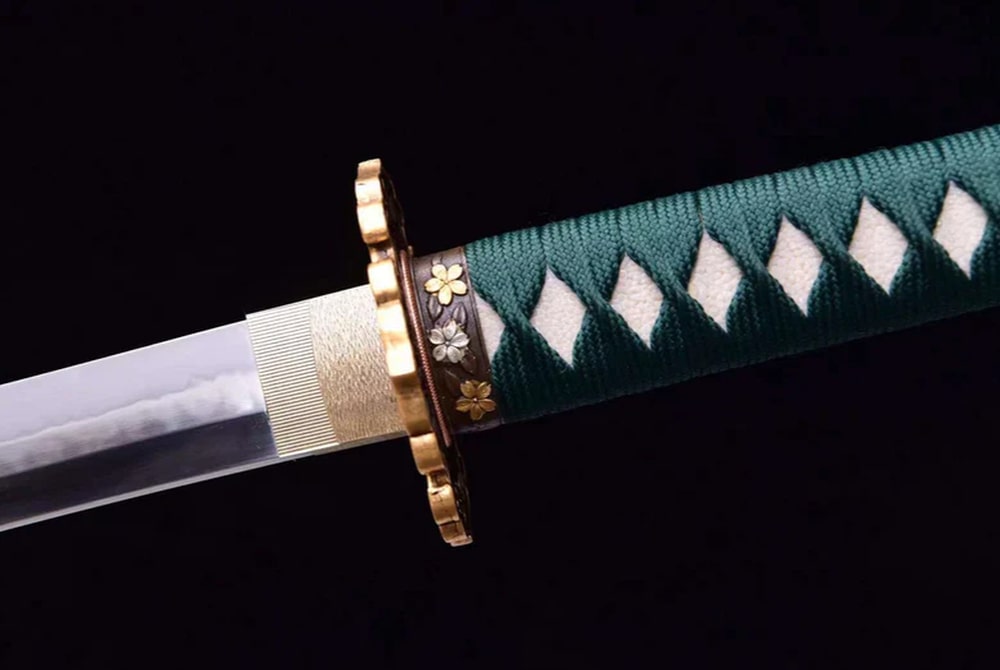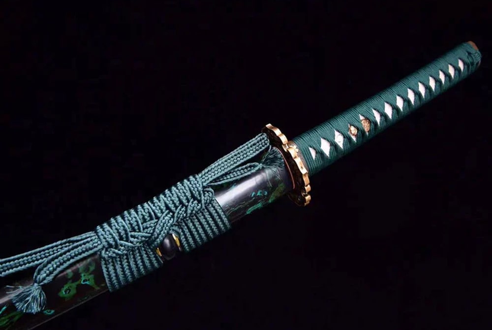 Discover the Midori no Ha Katana, a beautifully forged T10 steel sword featuring a distinctive Choji Hamon that highlights its meticulous craftsmanship. The green handle decorated with traditional motifs offers classic elegance, while the copper tsuba is embellished with delicate floral designs. Ideal for collectors and admirers of fine Japanese craftsmanship.