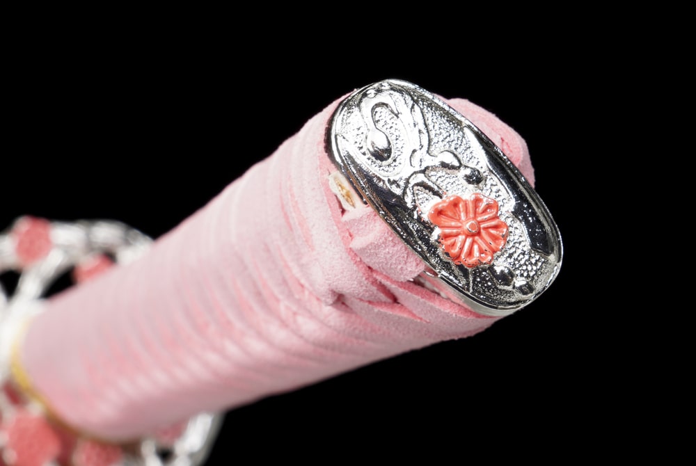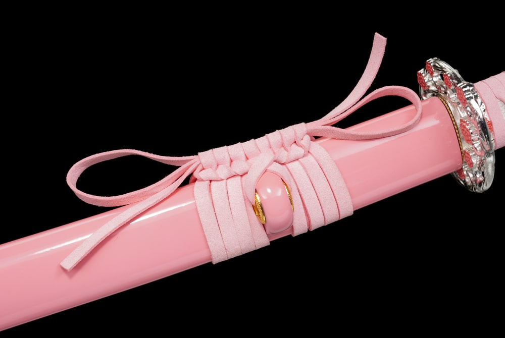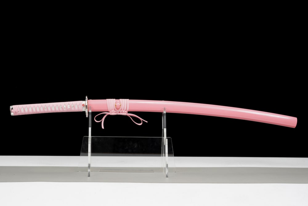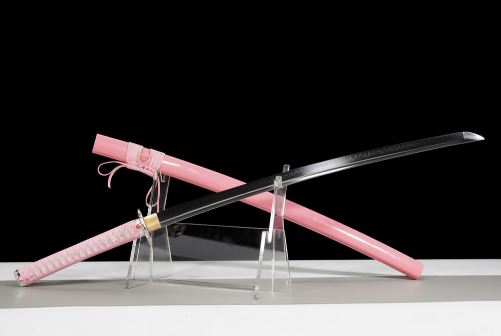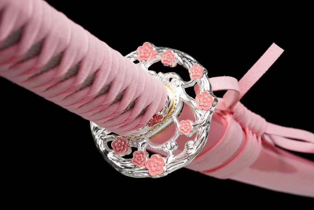 If you love pink tones and Japanese delicacy, the Momoiro no Yume Katana (夢の桃色 – Pink Dream) is sure to captivate you. Hand-forged from T10 steel, a premium-grade steel renowned for its exceptional strength and wear resistance, this sword perfectly blends aesthetic finesse with technical performance. Its polished blade reveals a visible wavy hamon under the light, a symbol of the meticulous craftsmanship of the swordsmith. The pink lacquered scabbard and matching tsuka (handle), wrapped in soft pastel pink braiding, give it a unique and refined charm while preserving the presence of a true samurai weapon.