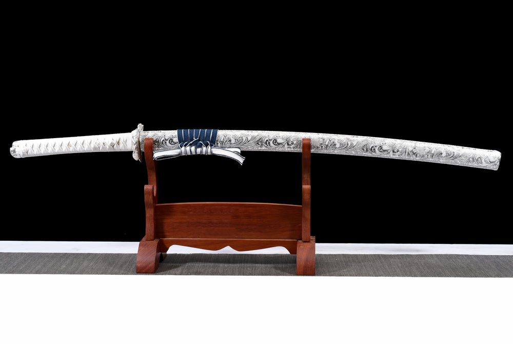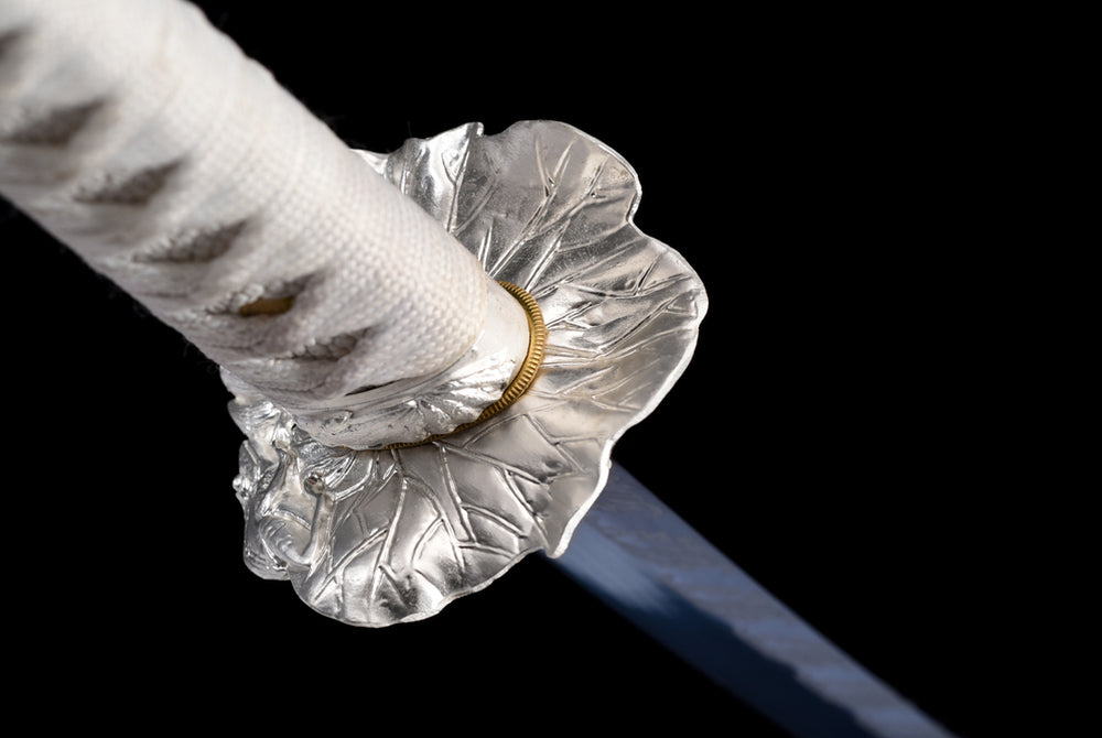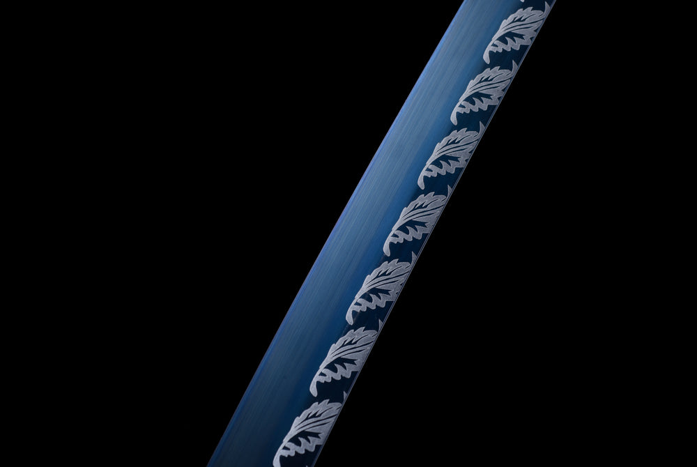 The blade of this sumptuous katana is a deep blue, adorned with a repeating leaf pattern along its entire length. Crafted from manganese steel, it has been hand-forged and carefully polished. The scabbard is a true masterpiece as well — made from wood and wrapped in finely worked leather, it immediately draws the eye. The handle is solid wood, and the alloy tsuba is delicately sculpted in the shape of a veined leaf.