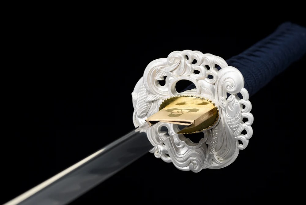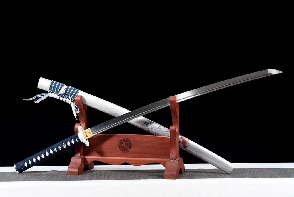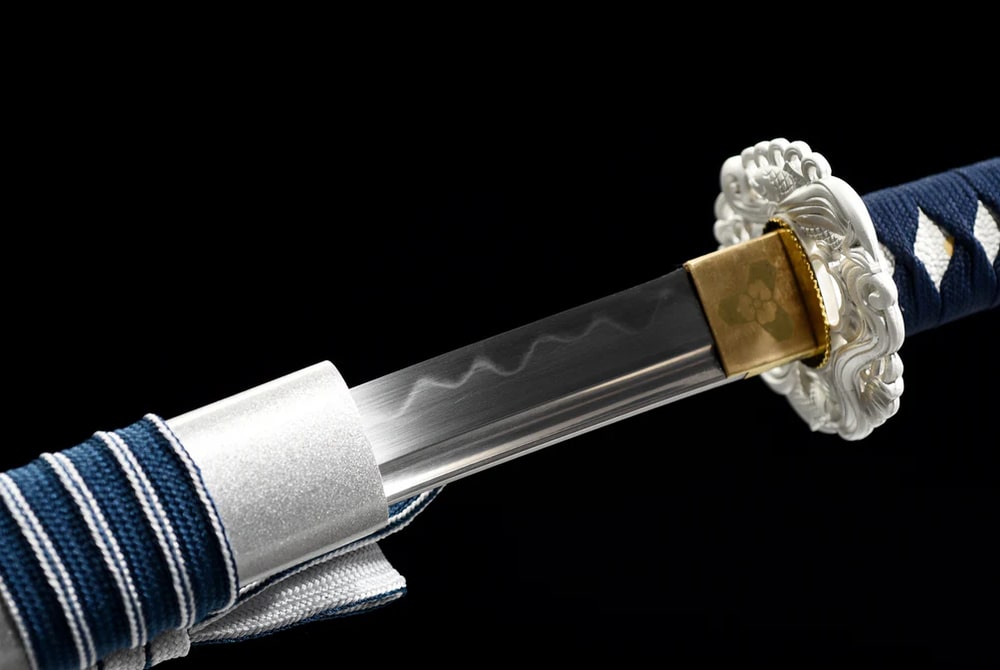 The handle and scabbard stand out with their splendid blend of white and blue, symbolizing elegance and the quiet strength of legendary samurai. These colours also evoke the purity of steel and the serenity of calm waters.
