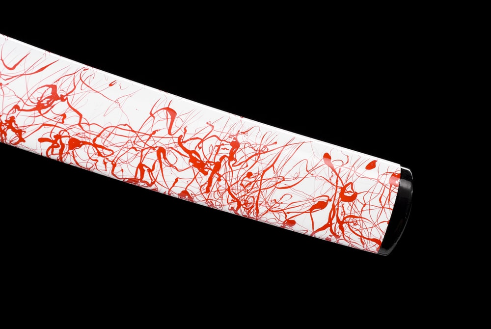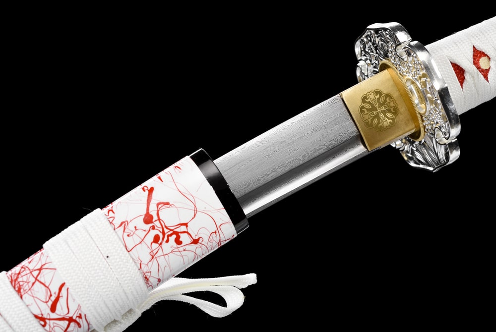 This Damascus steel tanto is both elegant and unique. Its blade reveals beautiful forged patterns, symbolizing quality and strength. The white scabbard with red accents immediately catches the eye, as does the finely decorated silver tsuba. A modern and refined piece, perfect for lovers of fine Japanese blades.