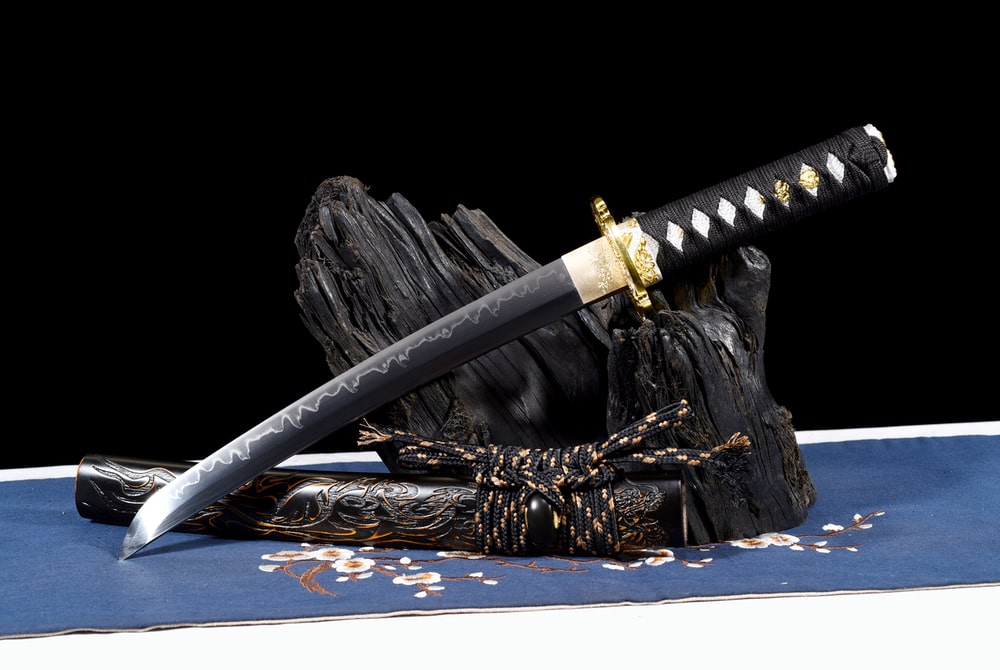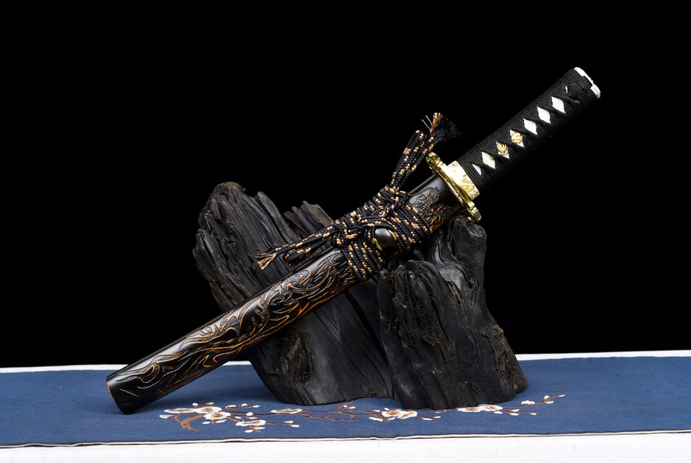 This Japanese tanto made from T10 steel combines elegance and power. Its bright blade with a wavy hamon reflects the finesse of traditional craftsmanship. The black scabbard decorated with golden patterns evokes flames, giving the sword a noble and dynamic presence. The richly sculpted golden tsuba and braided black handle complete a harmonious design, faithful to the spirit of traditional Japanese weapons.