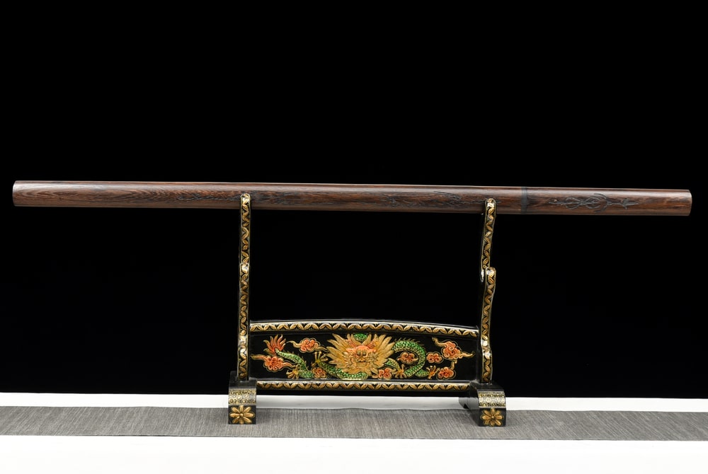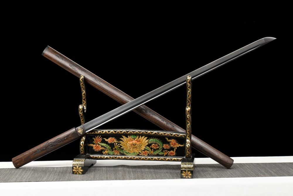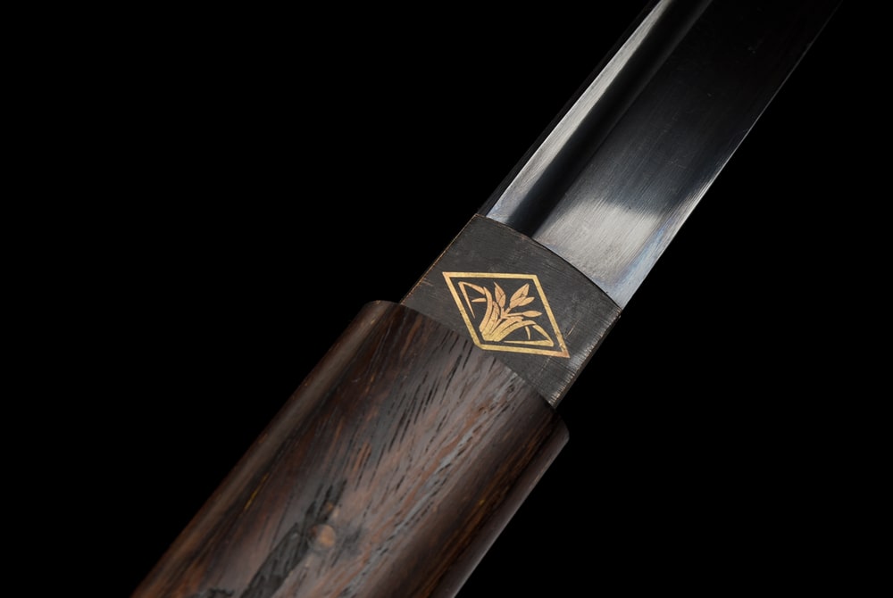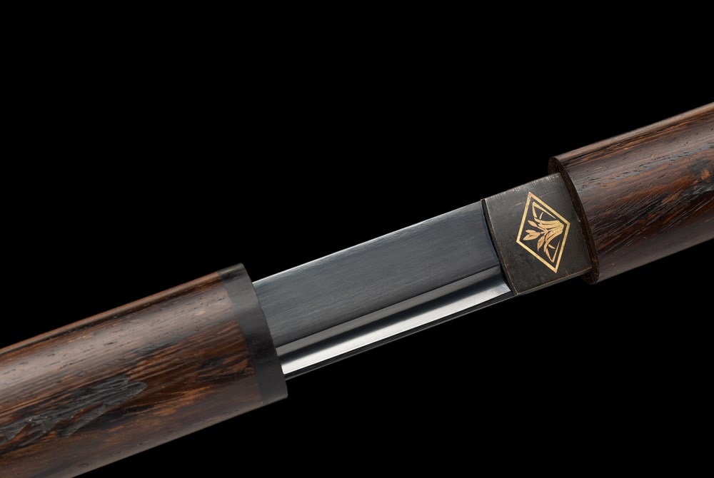 Combining elegance and discretion, this rosewood ninjatō stands out with its minimalist design and straight manganese steel blade, true to the weapons of real shinobi. Its natural finish highlights the dark grain of the wood, while the straight, uncurved blade evokes the precision and speed of warriors of the shadows. A sword as refined as it is formidable, perfect for collectors seeking authenticity and balance.
