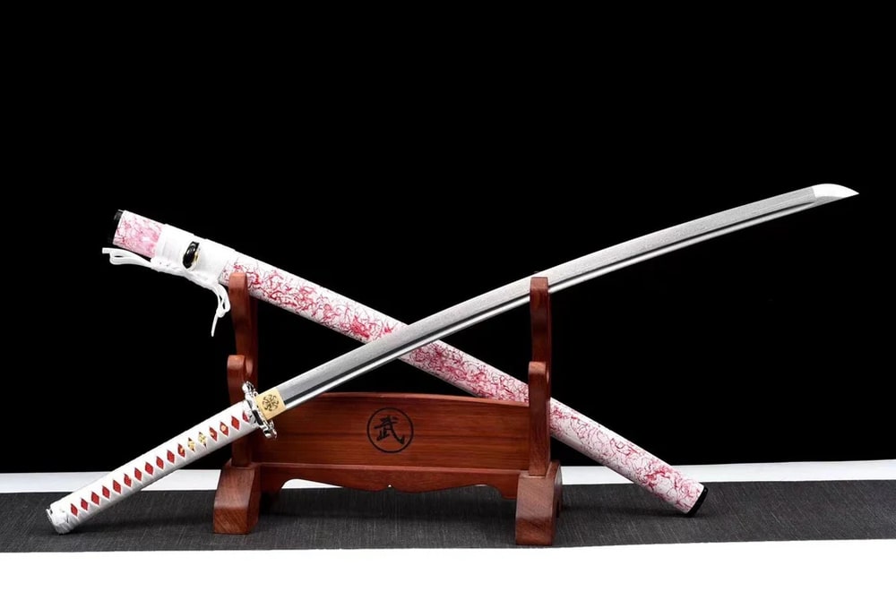 This Japanese katana features a clean and elegant design that highlights a hand-forged blade made from high-performance Damascus steel. It is also adorned with beautiful pink patterns that perfectly express the splendour and charm of the Japanese world.