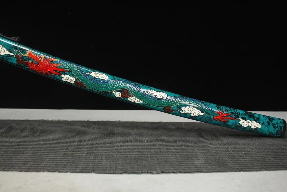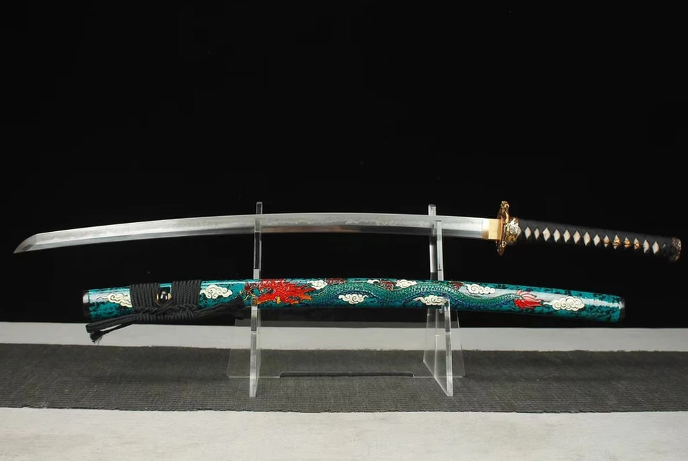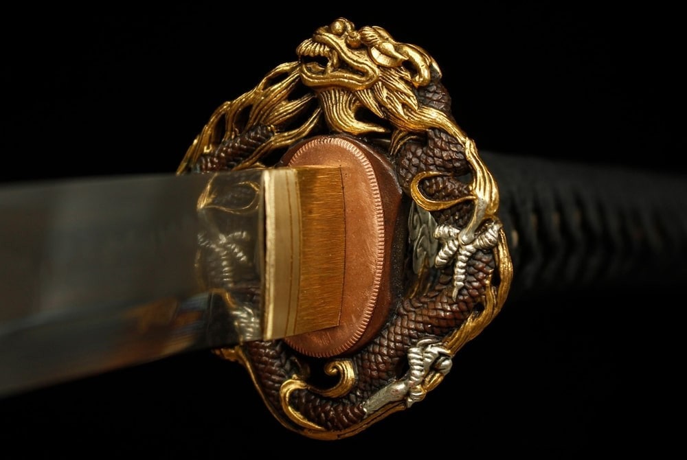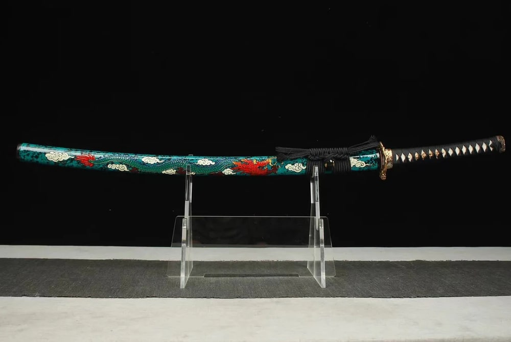 The elegant handle of the katana is wrapped in Japanese silk, offering a comfortable and authentic grip. The genuine ray skin covering the handle reflects the meticulous attention to detail. Real gold fittings add a refined touch to this exceptional piece. The saya of the Tatsu no Buke Katana is a work of art in itself, hand-painted with a majestic Japanese dragon.