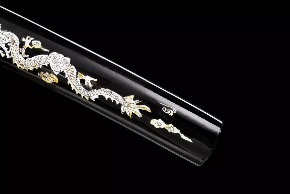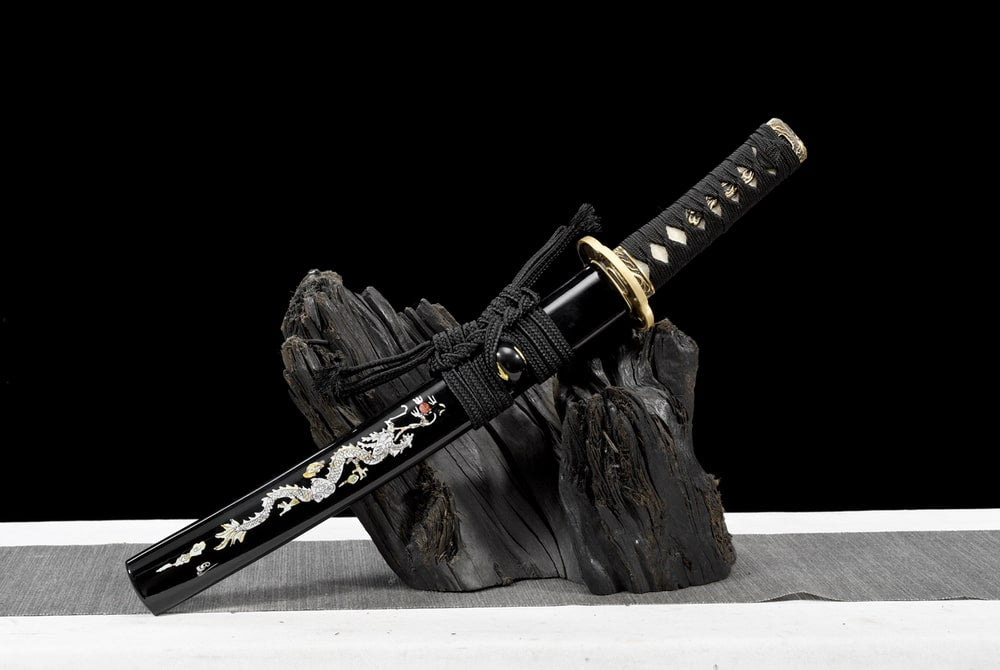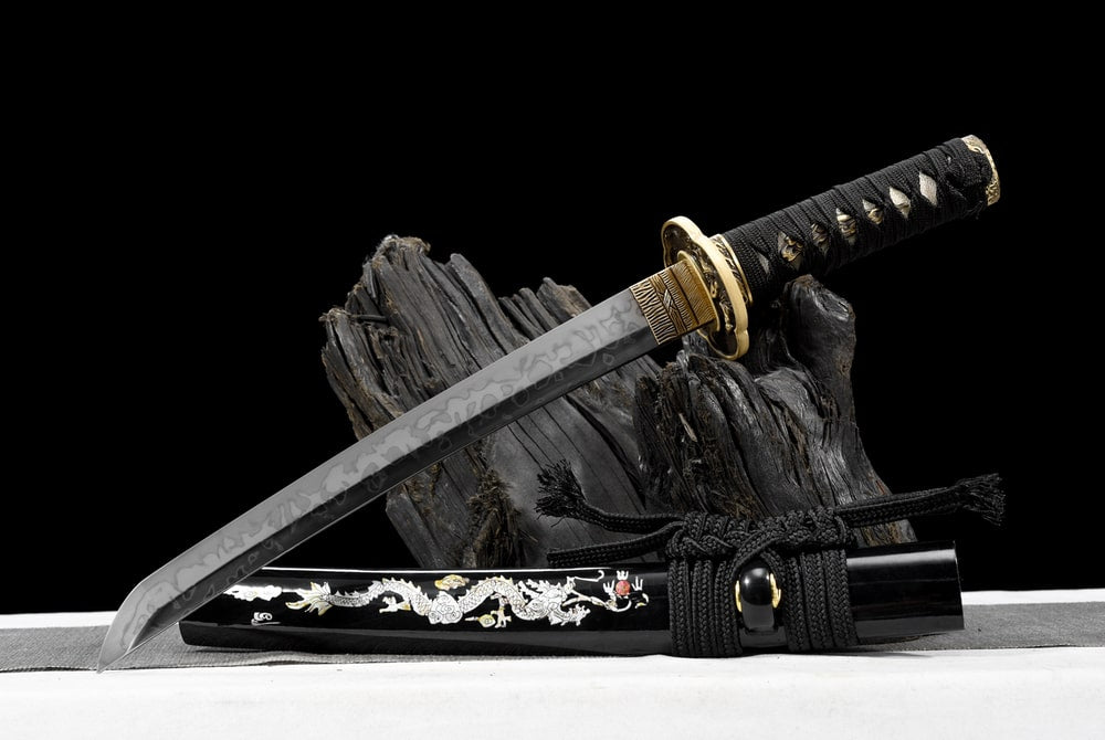 Forged from high-carbon T10 steel, this tanto combines a razor-sharp edge with remarkable durability. Its distinctive hamon, created through differential hardening, showcases the full mastery of Japanese swordsmithing. The black lacquered scabbard, decorated with a silver dragon, symbolizes strength and protection, giving this tanto a noble and imposing presence.